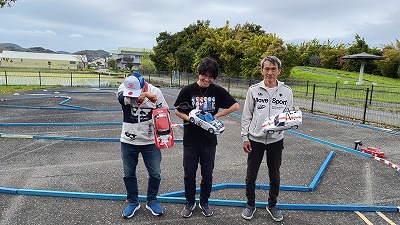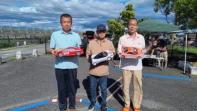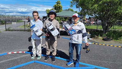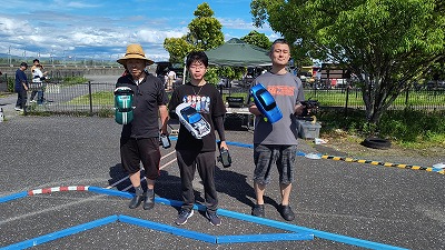 今回は6分となった決勝Aメイン、まずはTQのテラウチ選手と2位スタートのかりや選手による激しいトップ争いが展開されますが、テラウチ選手が最後までトップを守り切ってポールtoウィンを決めました。見ごたえあるレースを展開したかりや選手は惜しくも2位に、3位には、スタート直後に順位を落としたものの、挽回の走りを見せたてるりん選手が入りました。